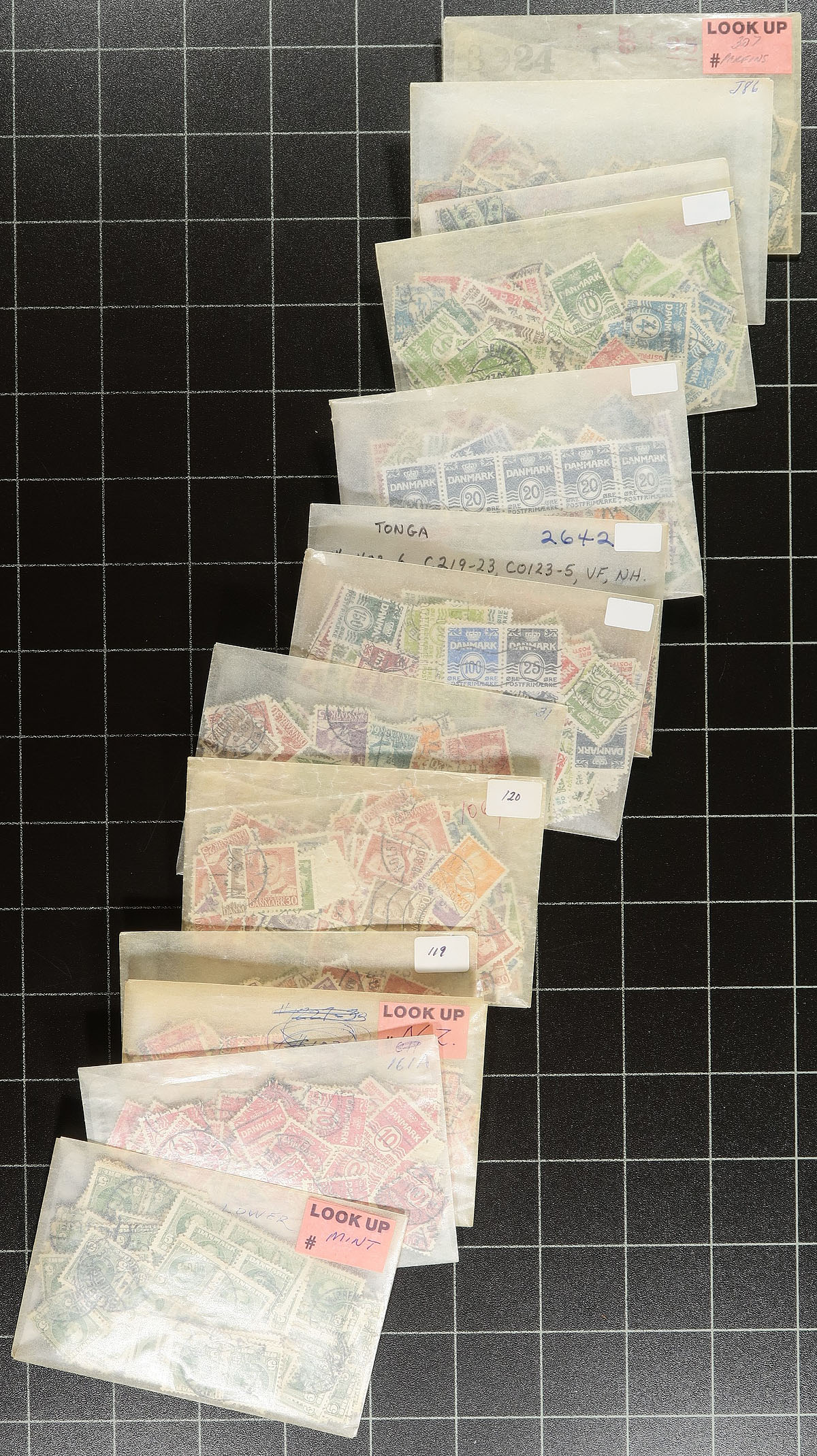 A chaotic holding of used, off paper, from the first half of the 20th century "Ore" issues to about 1950. Sometimes sorted by stamp, sometimes by issue, sometimes not at all, in about 100 old glassine envelopes that give no clues as to their contents. Lots of range, mostly more common material with many "Coat of Arms", wavy-line numerals, and King Christian X issues. Includes some multiples. Substantial duplication. Substantial cancel potential as every envelope seems to have lots of readable cancels. Presumably not checked against Facit for printing variants. Fills a medium sized file-card box. Estimate =
