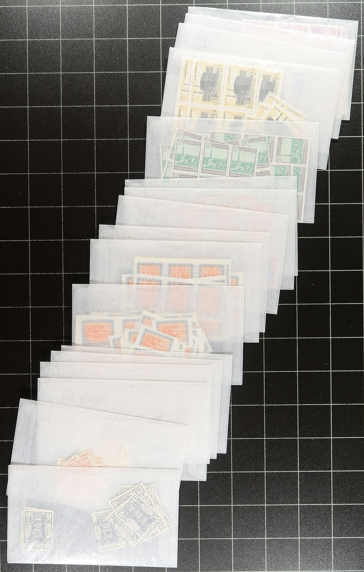 A shoebox filled with #4 sized glassine envelopes with the mint separated from the used and each with a light pencil mark as to the Scott number. Most pre-1980 and up to about 50 of a kind. Although about equal in volume, the mint (with a mix of hinged and never hinged) is the more valuable material, including #265, #380-382, #474, #786-7 (8 sets), #C88 (x30). Most are scattered singles with lots of digging to be done in the "Oil and Gas Plant" issues, and the back of the book. Substantial catalogue value here. Estimate =