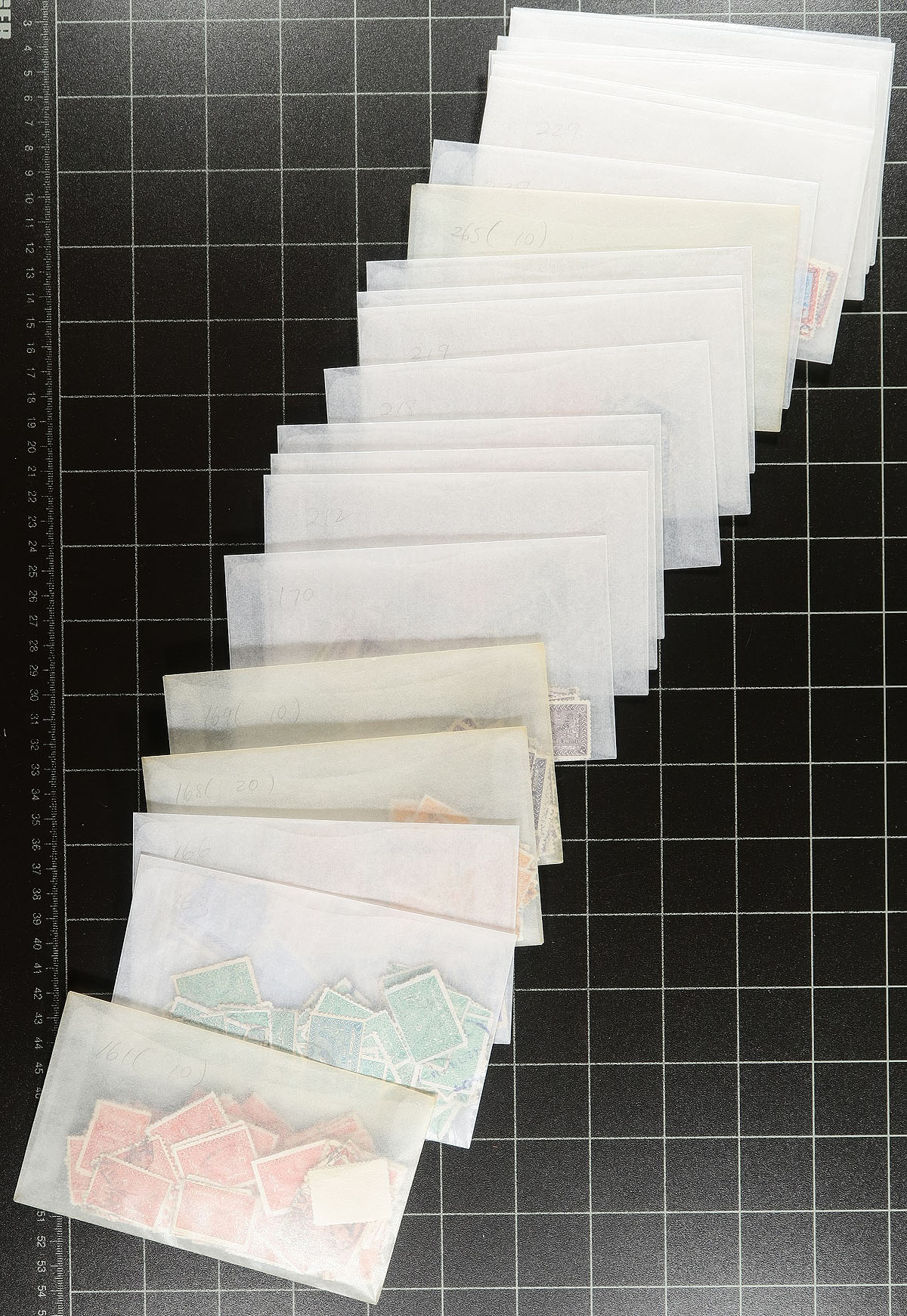 A shoebox filled with #4 sized glassine envelopes with the mint separated from the used and each with a light pencil mark as to the Scott number. Most pre-1980 and up to about 50 of a kind. Although about equal in volume, the mint (with a mix of hinged and never hinged) is the more valuable material, including #265, #380-382, #474, #786-7 (8 sets), #C88 (x30). Most are scattered singles with lots of digging to be done in the "Oil and Gas Plant" issues, and the back of the book. Substantial catalogue value here. Estimate =