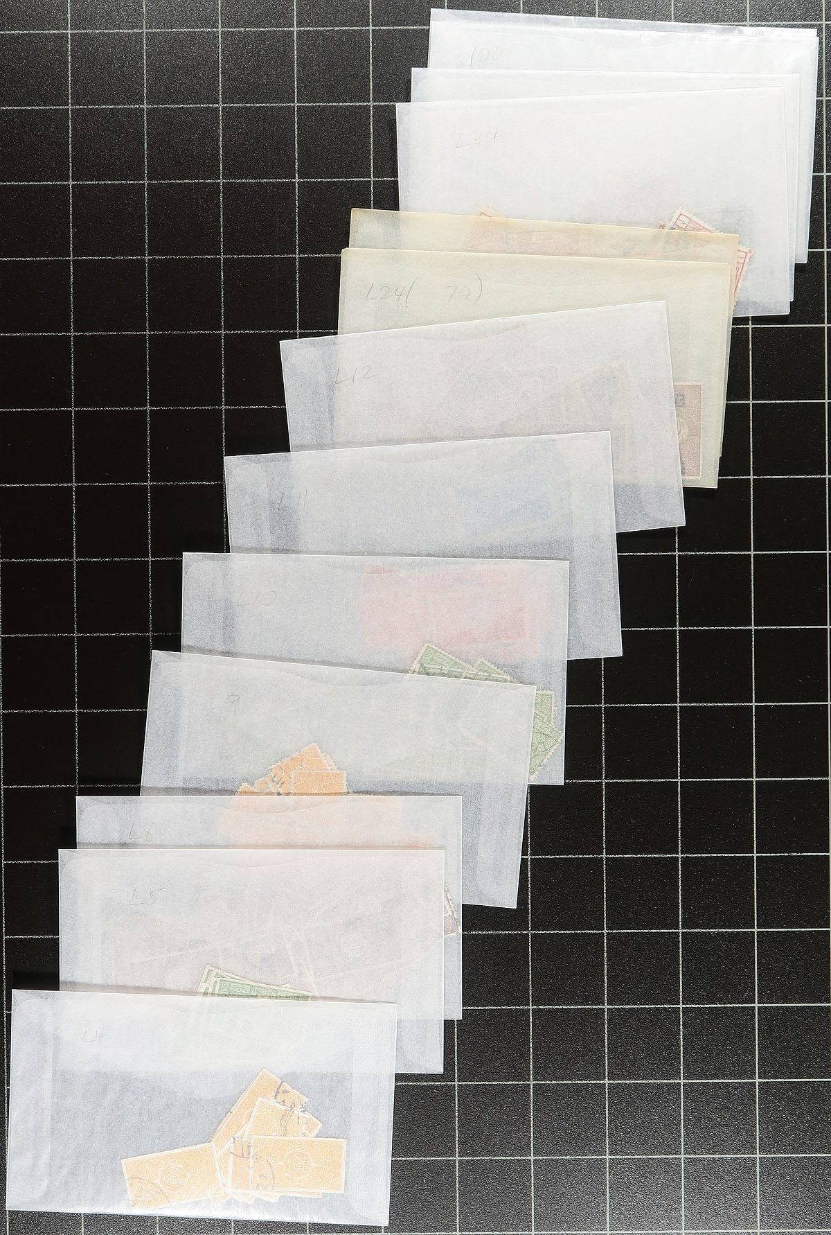 A shoebox filled with #4 sized glassine envelopes with the mint separated from the used and each with a light pencil mark as to the Scott number. Most pre-1980 and up to about 50 of a kind. Although about equal in volume, the mint (with a mix of hinged and never hinged) is the more valuable material, including #265, #380-382, #474, #786-7 (8 sets), #C88 (x30). Most are scattered singles with lots of digging to be done in the "Oil and Gas Plant" issues, and the back of the book. Substantial catalogue value here. Estimate =