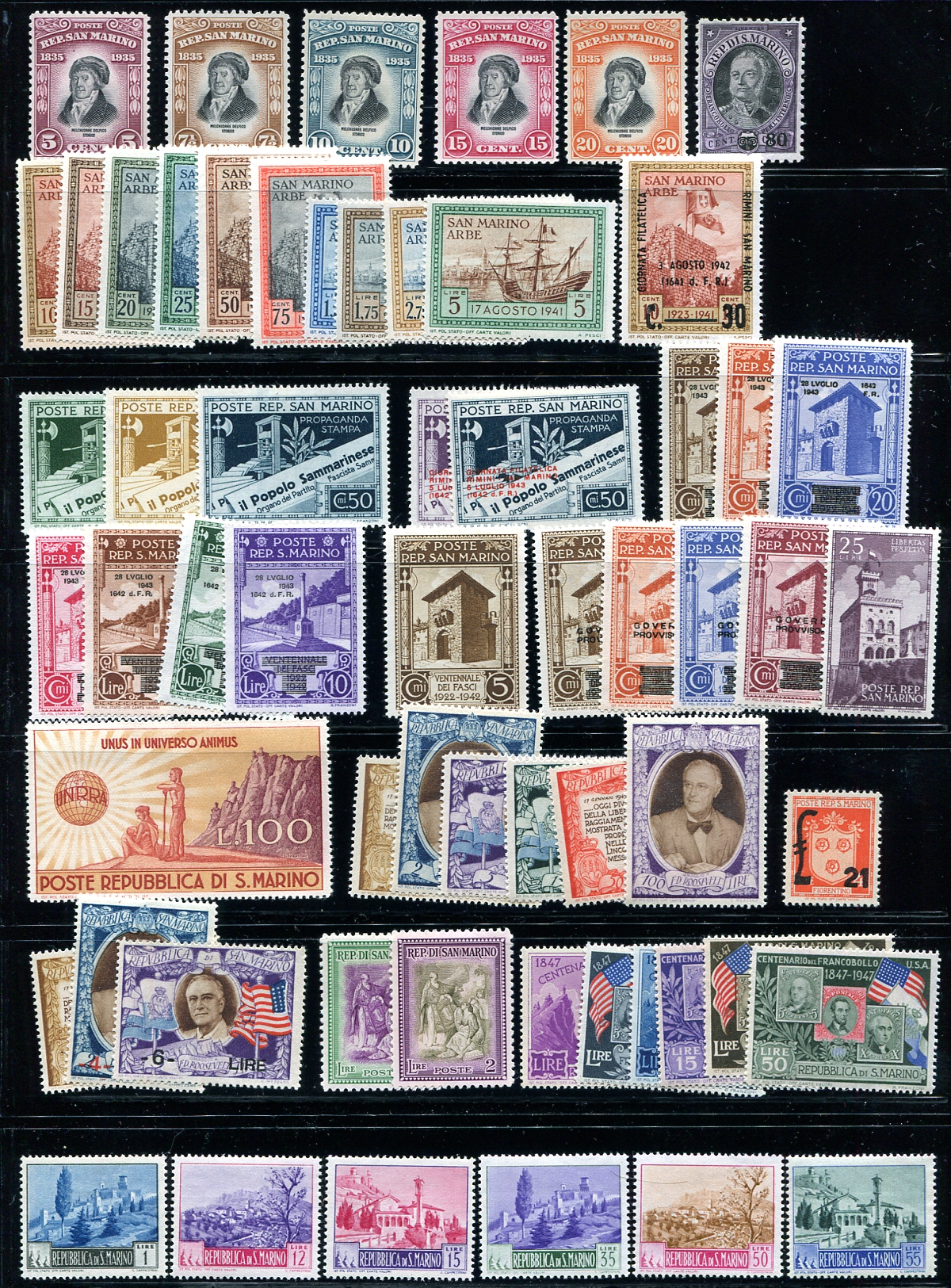 A two-page selection of mint, regular issues up to 1950. Very fresh appearance with better singles such as #40, $58, #83, #111, #291. A few of the earlier have heavy hinging/remnants, but most are in excellent, hinged condition. A great, smaller country for those who collect Europe or Italy or just want a fascinating and manageable collecting area. 2024 Scott US$425.35 =
