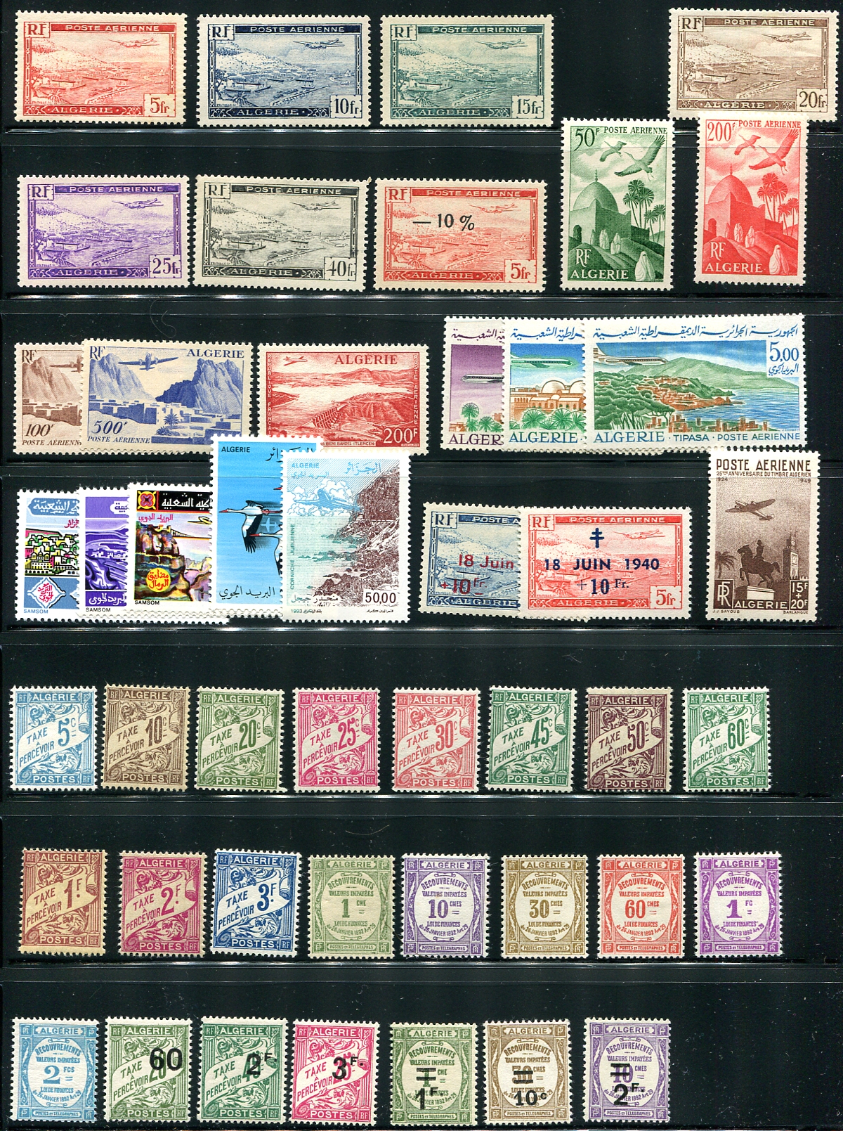 Two pages of mint "back of the book" with a near complete selection of airmail (missing only three), and complete groups of the semi-postal airmails and newspaper stamps. The postage due selection is quite thorough (missing only a half dozen examples) including the 1962 Independence overprints with both handstamp and typographed overprints. Fresh, fault free and most are lightly hinged or never hinged. 2024 Scott US$494.00 =