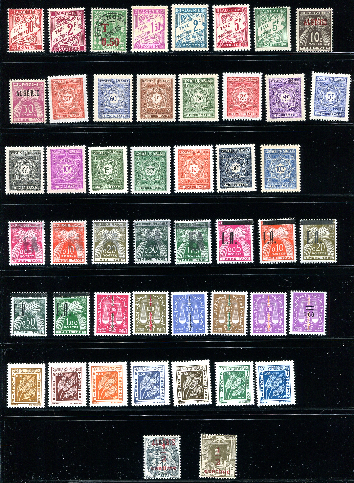 Two pages of mint "back of the book" with a near complete selection of airmail (missing only three), and complete groups of the semi-postal airmails and newspaper stamps. The postage due selection is quite thorough (missing only a half dozen examples) including the 1962 Independence overprints with both handstamp and typographed overprints. Fresh, fault free and most are lightly hinged or never hinged. 2024 Scott US$494.00 =