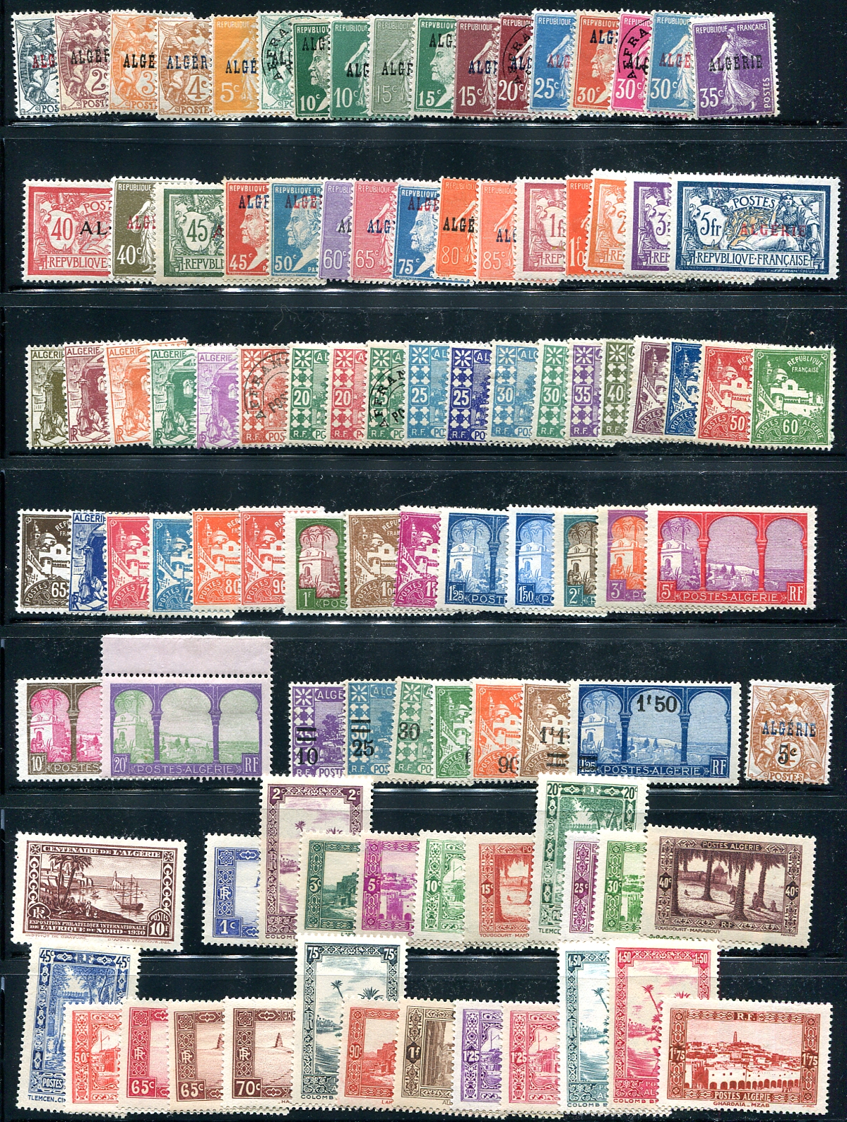 Two-page mint selection of earlier regular issue Algerian stamps including a complete run of inter-war issues (to #137) and then a selection of better sets and singles up to post-Independence 1965. The first early, long sets are complete and there is both the typographed and handstamped "EA" overprints on French issues for the 1962 Independence. 2024 Scott US$572.65 =