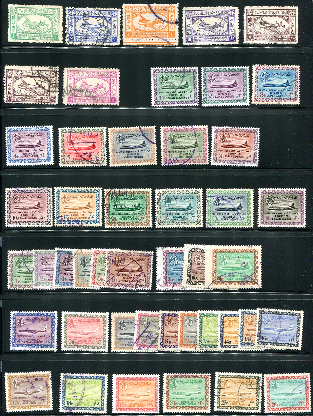 A page of the first airmail stamps up to the "Saudi Arabia Airlines" issue with the "Saud cartouche" includes the very scarce #C37. All nicely postally use and in decent condition. These don’t come around that often. 2024 Scott US$525.50 =