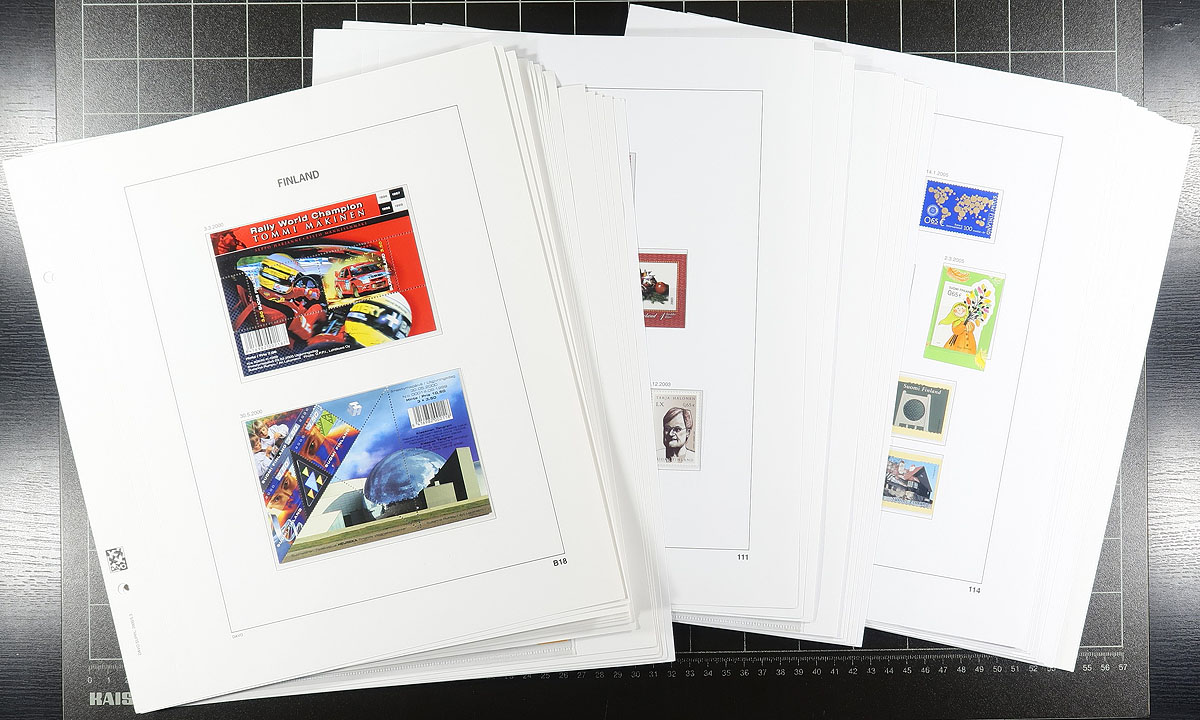 One man's holding of Finland, in three different stanzas. The first portion a mint collection on quadrille pages from the 19th century up to 1994, and while a bit sparse in the earlier material is largely complete from the mid-1960's onwards (hinged earlier, never hinged in mounts later). The second portion is Davo hingeless album pages for 2000-2005, 90% complete for the period, mint, including "Euro" values which started in 2002. The third and final instalment is the annual collection books for 2006-2010 (complete), plus pack of misc Christmas greeting cards sent from the Philatelic Bureau to the collector. Immense original cost. Owner's estimated catalogue value is $2000.00, which is quite possible. Estimate =