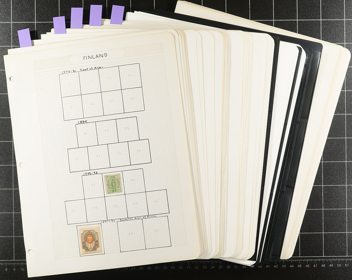 One man's holding of Finland, in three different stanzas. The first portion a mint collection on quadrille pages from the 19th century up to 1994, and while a bit sparse in the earlier material is largely complete from the mid-1960's onwards (hinged earlier, never hinged in mounts later). The second portion is Davo hingeless album pages for 2000-2005, 90% complete for the period, mint, including "Euro" values which started in 2002. The third and final instalment is the annual collection books for 2006-2010 (complete), plus pack of misc Christmas greeting cards sent from the Philatelic Bureau to the collector. Immense original cost. Owner's estimated catalogue value is $2000.00, which is quite possible. Estimate =