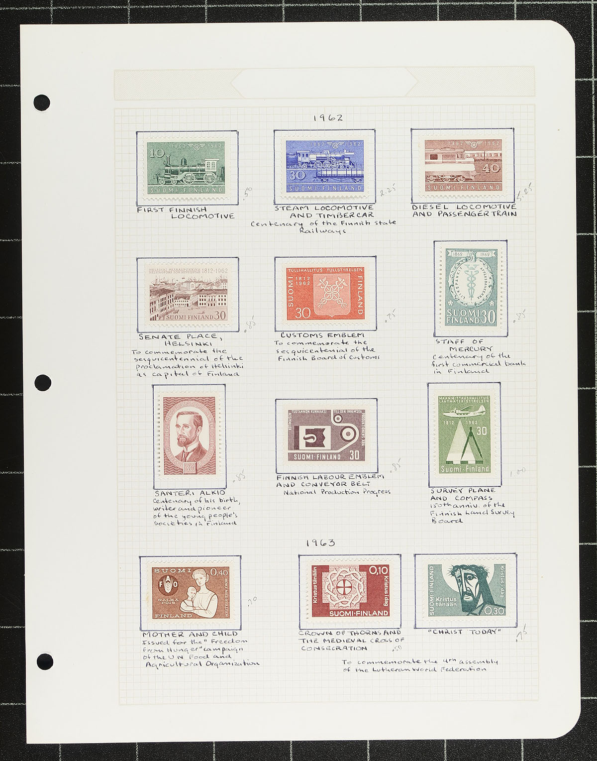 One man's holding of Finland, in three different stanzas. The first portion a mint collection on quadrille pages from the 19th century up to 1994, and while a bit sparse in the earlier material is largely complete from the mid-1960's onwards (hinged earlier, never hinged in mounts later). The second portion is Davo hingeless album pages for 2000-2005, 90% complete for the period, mint, including "Euro" values which started in 2002. The third and final instalment is the annual collection books for 2006-2010 (complete), plus pack of misc Christmas greeting cards sent from the Philatelic Bureau to the collector. Immense original cost. Owner's estimated catalogue value is $2000.00, which is quite possible. Estimate =