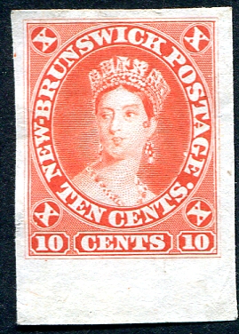 Trial Colour Proof of the 10c Victoria Issue die proof in orange. A couple minor areas of age spotting are noticeable only under magnification and light crease LR corner (contained in the selvedge, well clear of the stamp image). Clear margins all around. Stunning in appearance. 2024 Unitrade =