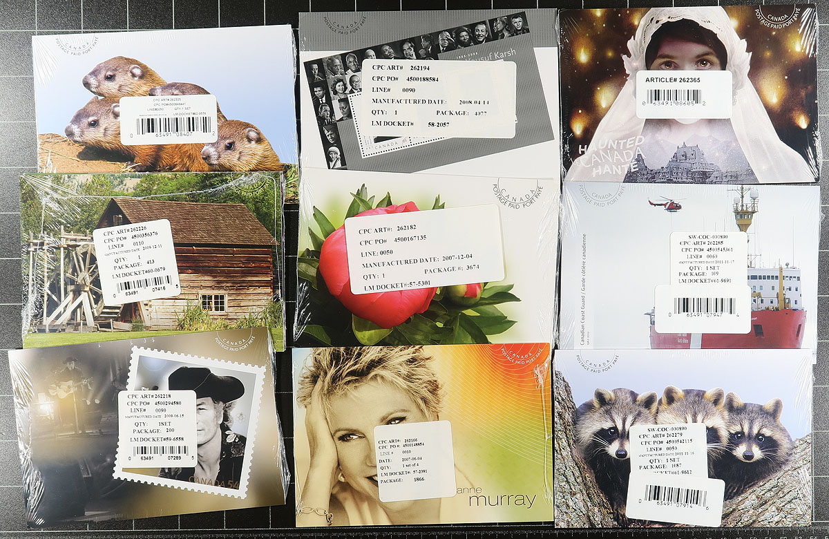 Postal Stationery Post Office issued prepaid postcards. An attractive selection of 160 postcards (including many sealed packs) from roughly 2005 til 2014. These wonderfully illustrated postcards are good for mailing anywhere in the world. So potentially, they have a value of $3.65 each (the international letter-rate). There is an amazing array of topics covered here including UNESCO, Canadian Photography, Miss Supertest, Wildlife, Haunted Canada etc (to name a few). Total potential face value =