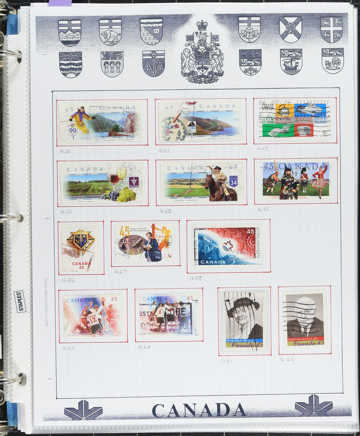 Attractive primarily Elizabethan 1949-2012 used collection, arranged on collector printed pages, in sheet-protectors in three Minkus Canada binders. A seemingly "one of each", with a total of 2425 stamps, which is quite complete for the first 50 years, then about 50% full post-2000 and includes some "back of the book" (postage dues, officials etc). A good solid used collection for the period. Estimate =