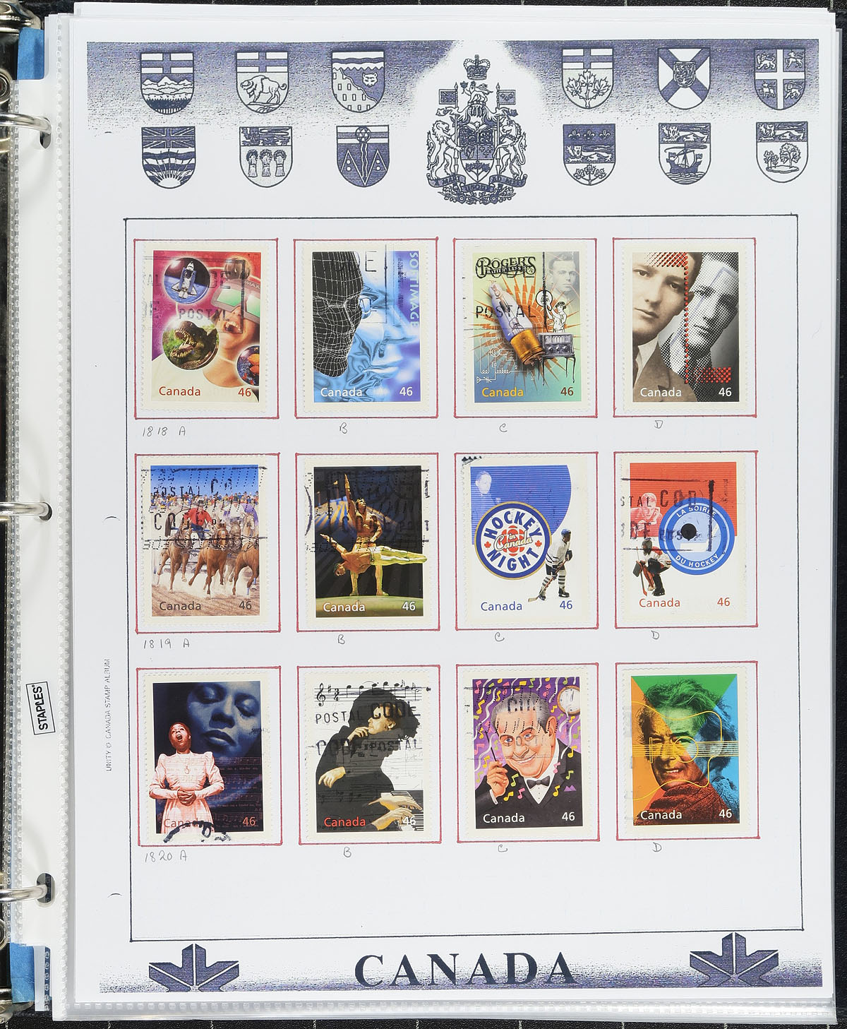 Attractive primarily Elizabethan 1949-2012 used collection, arranged on collector printed pages, in sheet-protectors in three Minkus Canada binders. A seemingly "one of each", with a total of 2425 stamps, which is quite complete for the first 50 years, then about 50% full post-2000 and includes some "back of the book" (postage dues, officials etc). A good solid used collection for the period. Estimate =