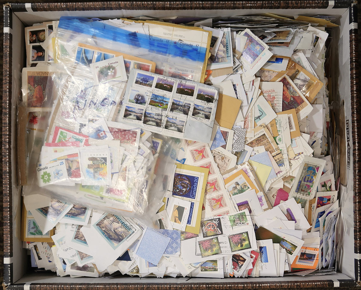 Bankers box filled with loose, close-cut single paper kiloware or off-paper mix including recent definitives. Also has a baggie filled with uncanceled stamps. About 20 lbs of material here. Estimate =