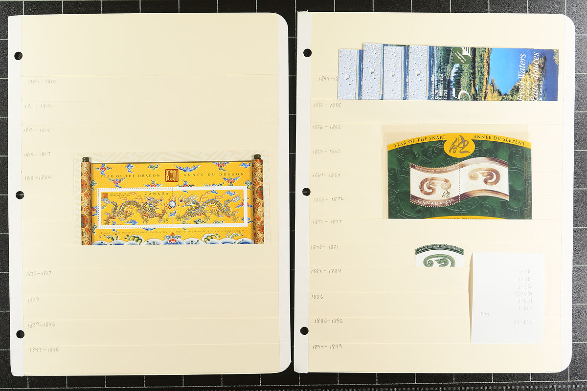 Mega Mint Holding. The continuation from this high-quality holding, with 1990-2009 issues, arranged on manila stocksheets withing a binder. Several better items of note including booklets, booklet panes, sheets, souvenir sheets, early die-cuts, self-adhesive, $8.00 Grizzly and Greeting Stamp booklets. Face value alone is $256.35. Owner's Unitrade =
