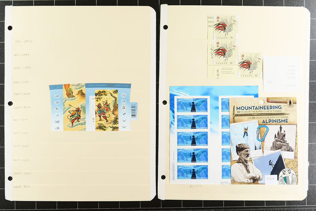 Mega Mint Holding. The continuation from this high-quality holding, with 1990-2009 issues, arranged on manila stocksheets withing a binder. Several better items of note including booklets, booklet panes, sheets, souvenir sheets, early die-cuts, self-adhesive, $8.00 Grizzly and Greeting Stamp booklets. Face value alone is $256.35. Owner's Unitrade =
