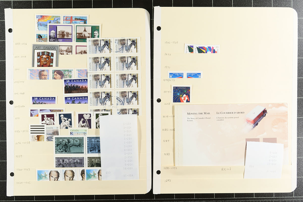 Mega Mint Holding. The continuation from this high-quality holding, with 1990-2009 issues, arranged on manila stocksheets withing a binder. Several better items of note including booklets, booklet panes, sheets, souvenir sheets, early die-cuts, self-adhesive, $8.00 Grizzly and Greeting Stamp booklets. Face value alone is $256.35. Owner's Unitrade =