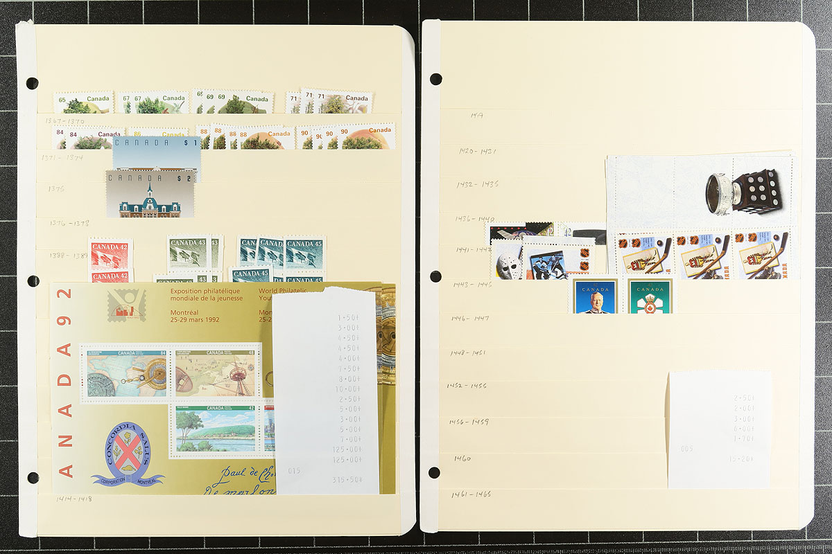 Mega Mint Holding. The continuation from this high-quality holding, with 1990-2009 issues, arranged on manila stocksheets withing a binder. Several better items of note including booklets, booklet panes, sheets, souvenir sheets, early die-cuts, self-adhesive, $8.00 Grizzly and Greeting Stamp booklets. Face value alone is $256.35. Owner's Unitrade =