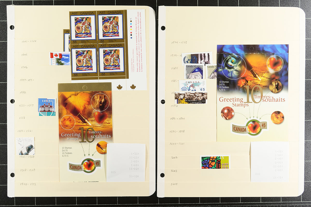 Mega Mint Holding. The continuation from this high-quality holding, with 1990-2009 issues, arranged on manila stocksheets withing a binder. Several better items of note including booklets, booklet panes, sheets, souvenir sheets, early die-cuts, self-adhesive, $8.00 Grizzly and Greeting Stamp booklets. Face value alone is $256.35. Owner's Unitrade =