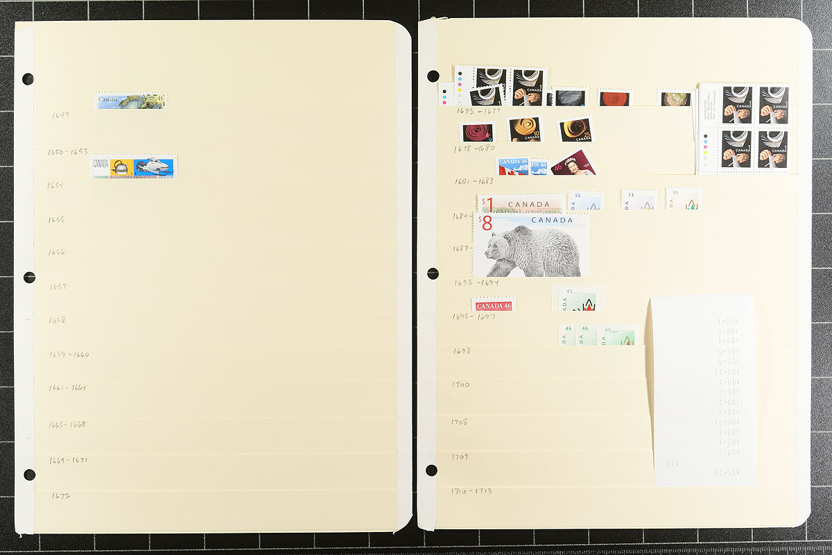 Mega Mint Holding. The continuation from this high-quality holding, with 1990-2009 issues, arranged on manila stocksheets withing a binder. Several better items of note including booklets, booklet panes, sheets, souvenir sheets, early die-cuts, self-adhesive, $8.00 Grizzly and Greeting Stamp booklets. Face value alone is $256.35. Owner's Unitrade =