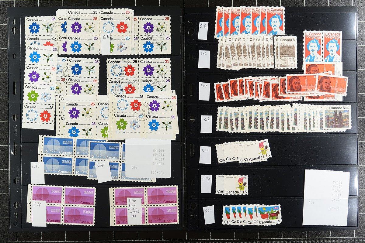 Mega Mint Holding. A lovely mint Never Hinged holding / stock of 1962-1976 Canadian stamps, including many plate blocks, multiples, varieties etc. Housed on 30 vario stockpages, within a binder, we noted many better items such as "Cello Paks", paper florescence, booklets, EXPO 70', mid/high value definitives and the 1975/1976 Olympic high-values. Cataloged by the previous owner, using only the lowest value given, so plenty of upside to the valuation count. Owner's Unitrade =