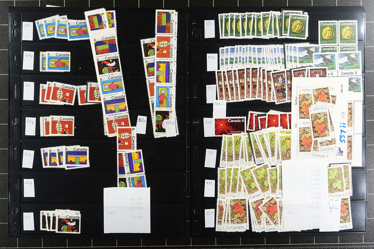 Mega Mint Holding. A lovely mint Never Hinged holding / stock of 1962-1976 Canadian stamps, including many plate blocks, multiples, varieties etc. Housed on 30 vario stockpages, within a binder, we noted many better items such as "Cello Paks", paper florescence, booklets, EXPO 70', mid/high value definitives and the 1975/1976 Olympic high-values. Cataloged by the previous owner, using only the lowest value given, so plenty of upside to the valuation count. Owner's Unitrade =