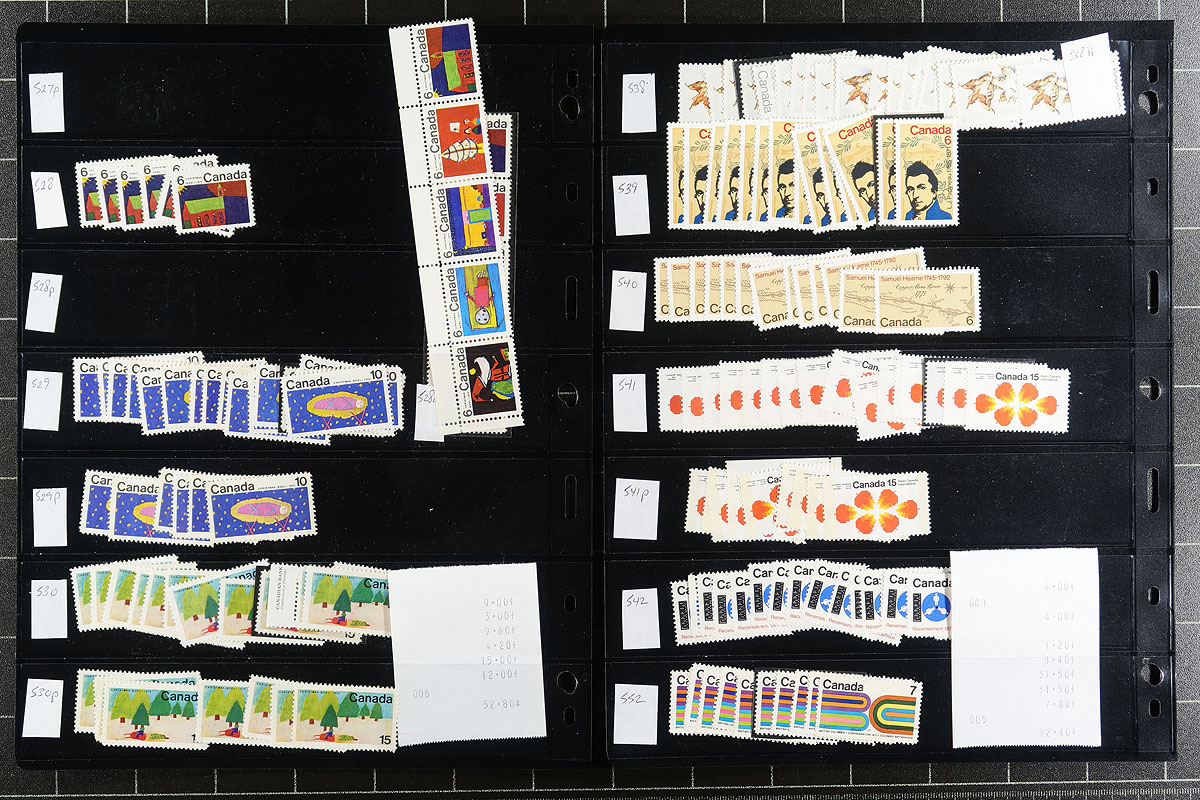 Mega Mint Holding. A lovely mint Never Hinged holding / stock of 1962-1976 Canadian stamps, including many plate blocks, multiples, varieties etc. Housed on 30 vario stockpages, within a binder, we noted many better items such as "Cello Paks", paper florescence, booklets, EXPO 70', mid/high value definitives and the 1975/1976 Olympic high-values. Cataloged by the previous owner, using only the lowest value given, so plenty of upside to the valuation count. Owner's Unitrade =