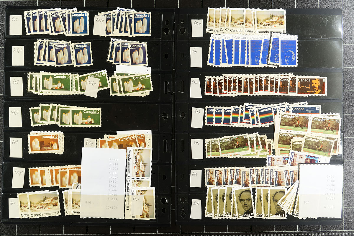 Mega Mint Holding. A lovely mint Never Hinged holding / stock of 1962-1976 Canadian stamps, including many plate blocks, multiples, varieties etc. Housed on 30 vario stockpages, within a binder, we noted many better items such as "Cello Paks", paper florescence, booklets, EXPO 70', mid/high value definitives and the 1975/1976 Olympic high-values. Cataloged by the previous owner, using only the lowest value given, so plenty of upside to the valuation count. Owner's Unitrade =