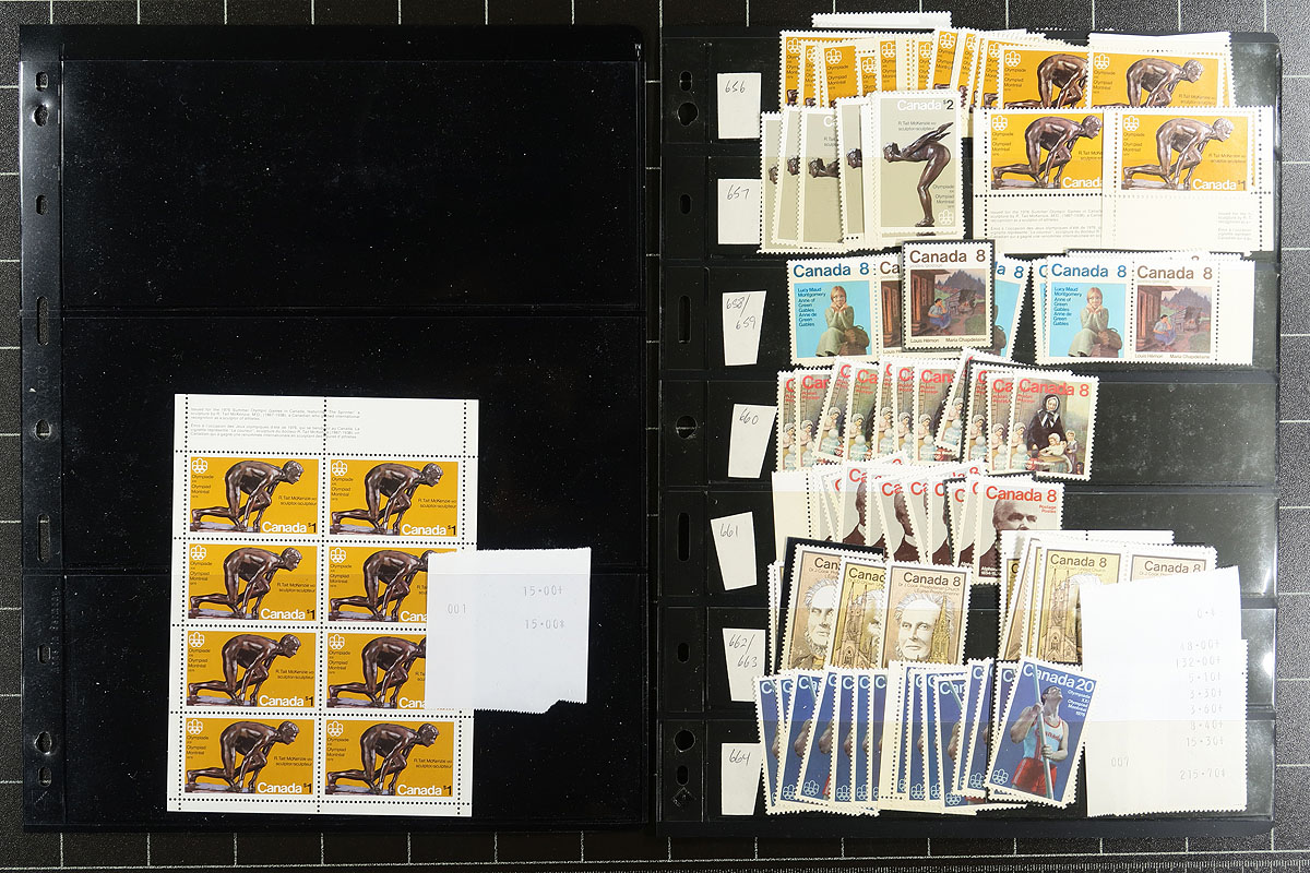 Mega Mint Holding. A lovely mint Never Hinged holding / stock of 1962-1976 Canadian stamps, including many plate blocks, multiples, varieties etc. Housed on 30 vario stockpages, within a binder, we noted many better items such as "Cello Paks", paper florescence, booklets, EXPO 70', mid/high value definitives and the 1975/1976 Olympic high-values. Cataloged by the previous owner, using only the lowest value given, so plenty of upside to the valuation count. Owner's Unitrade =