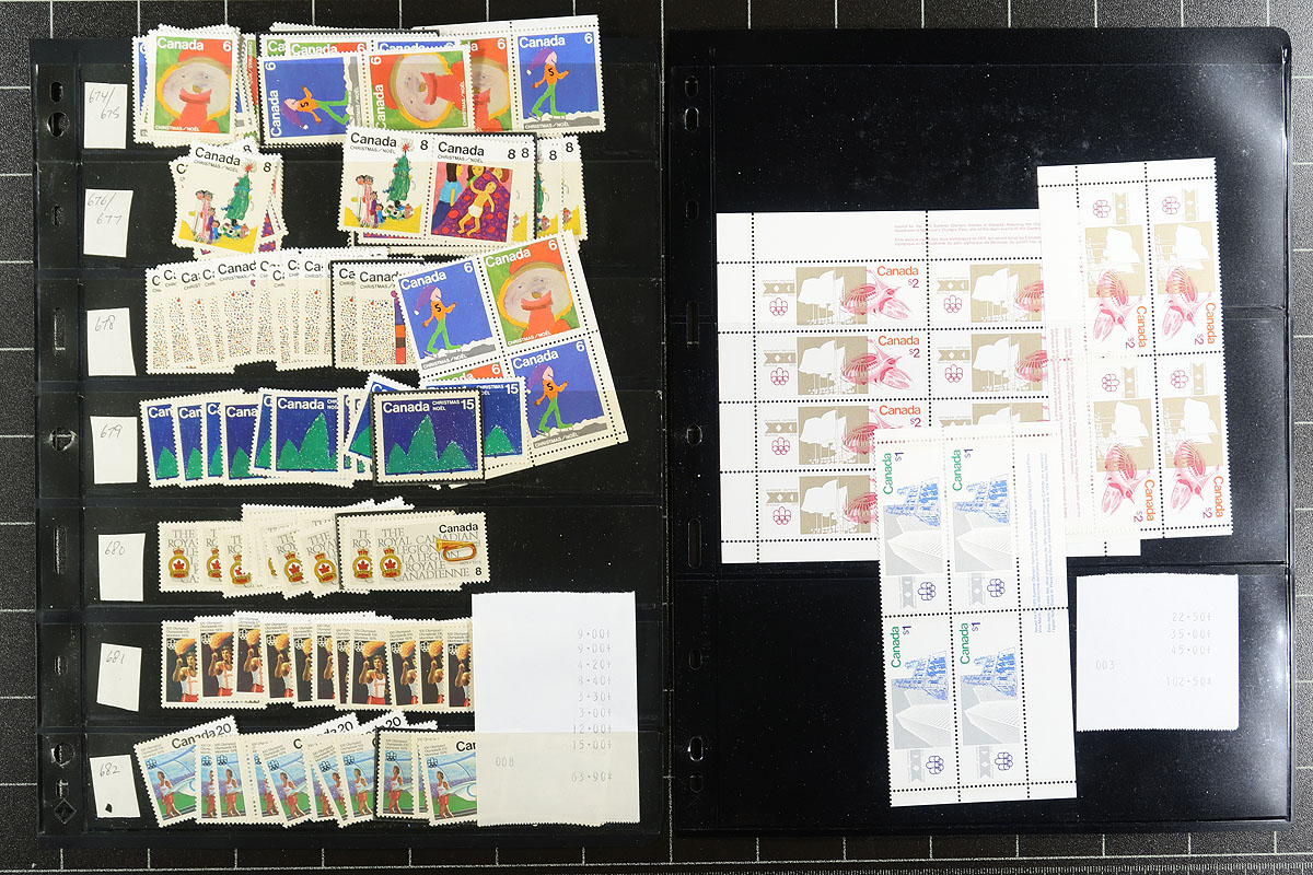 Mega Mint Holding. A lovely mint Never Hinged holding / stock of 1962-1976 Canadian stamps, including many plate blocks, multiples, varieties etc. Housed on 30 vario stockpages, within a binder, we noted many better items such as "Cello Paks", paper florescence, booklets, EXPO 70', mid/high value definitives and the 1975/1976 Olympic high-values. Cataloged by the previous owner, using only the lowest value given, so plenty of upside to the valuation count. Owner's Unitrade =