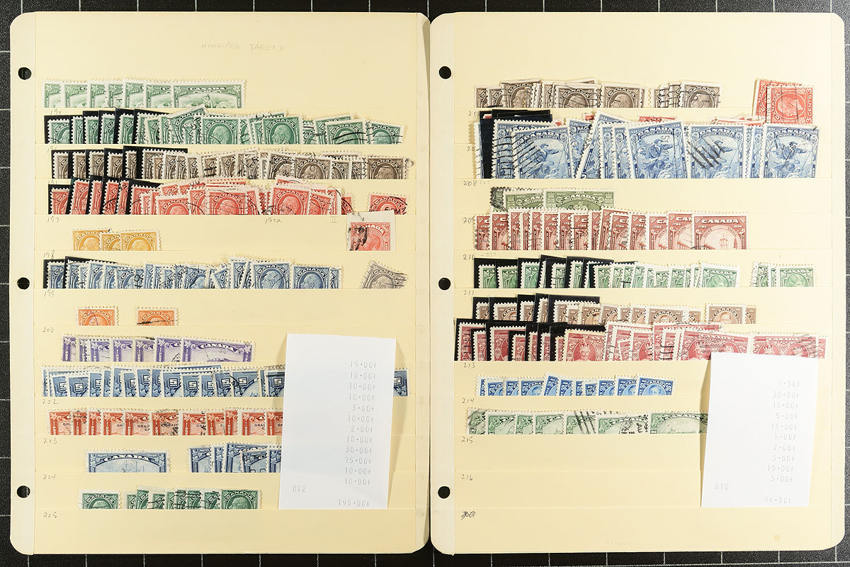 A high-quality old-time stock of early used Canadian material from 1859 "Cents" to the QEII Karsh issue, arranged on 27 manila pages, withing a binder. Loads of value here, and although the odd fault my be present in the earliest material, overall this is a very clean group. Lots of better postmarks noted, and a winters worth of "fly-specking" for the adventurous collector. Cataloged by the previous owner, using only the lowest value given, so plenty of upside to the valuation count. Owner's Unitrade =
