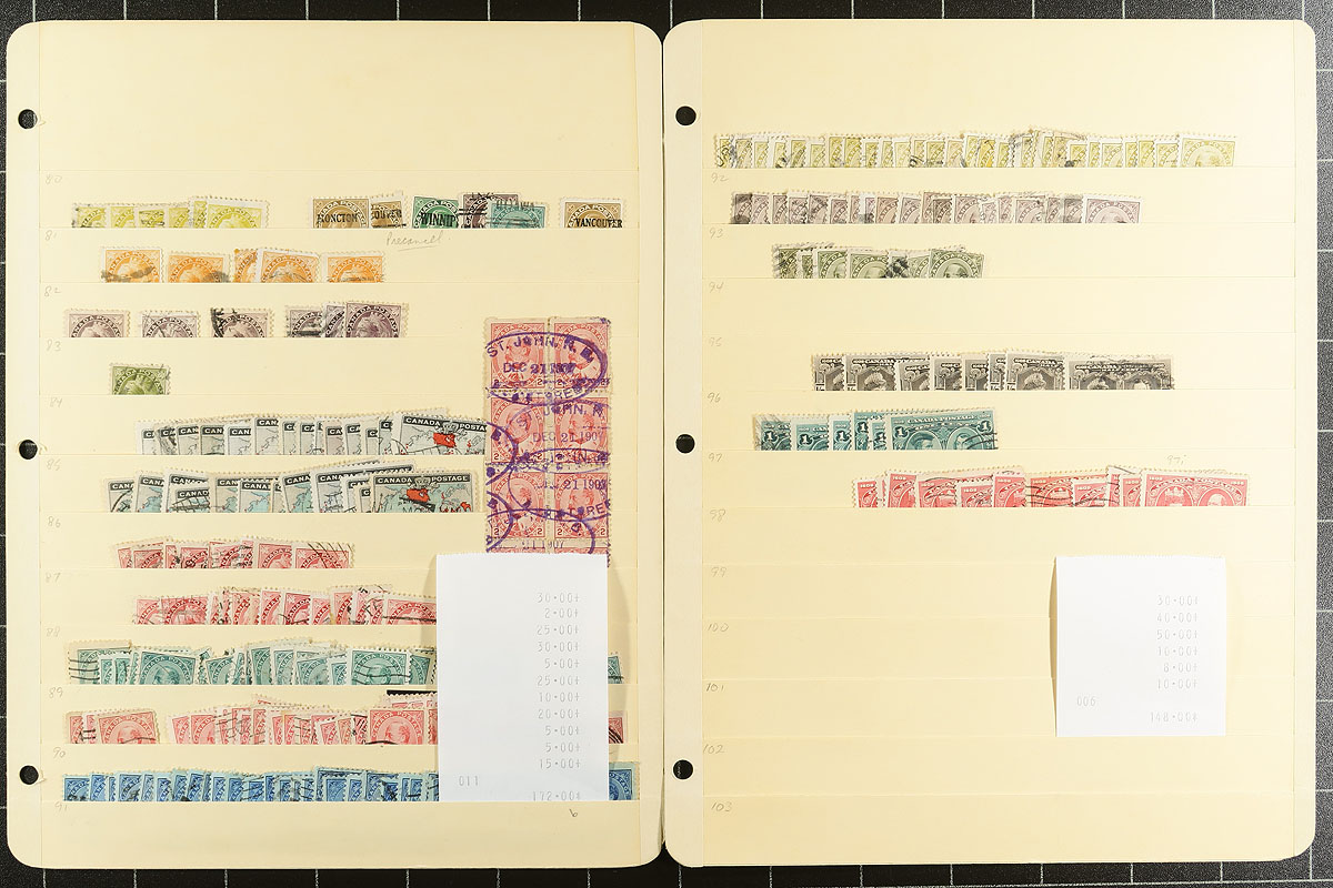 A high-quality old-time stock of early used Canadian material from 1859 "Cents" to the QEII Karsh issue, arranged on 27 manila pages, withing a binder. Loads of value here, and although the odd fault my be present in the earliest material, overall this is a very clean group. Lots of better postmarks noted, and a winters worth of "fly-specking" for the adventurous collector. Cataloged by the previous owner, using only the lowest value given, so plenty of upside to the valuation count. Owner's Unitrade =