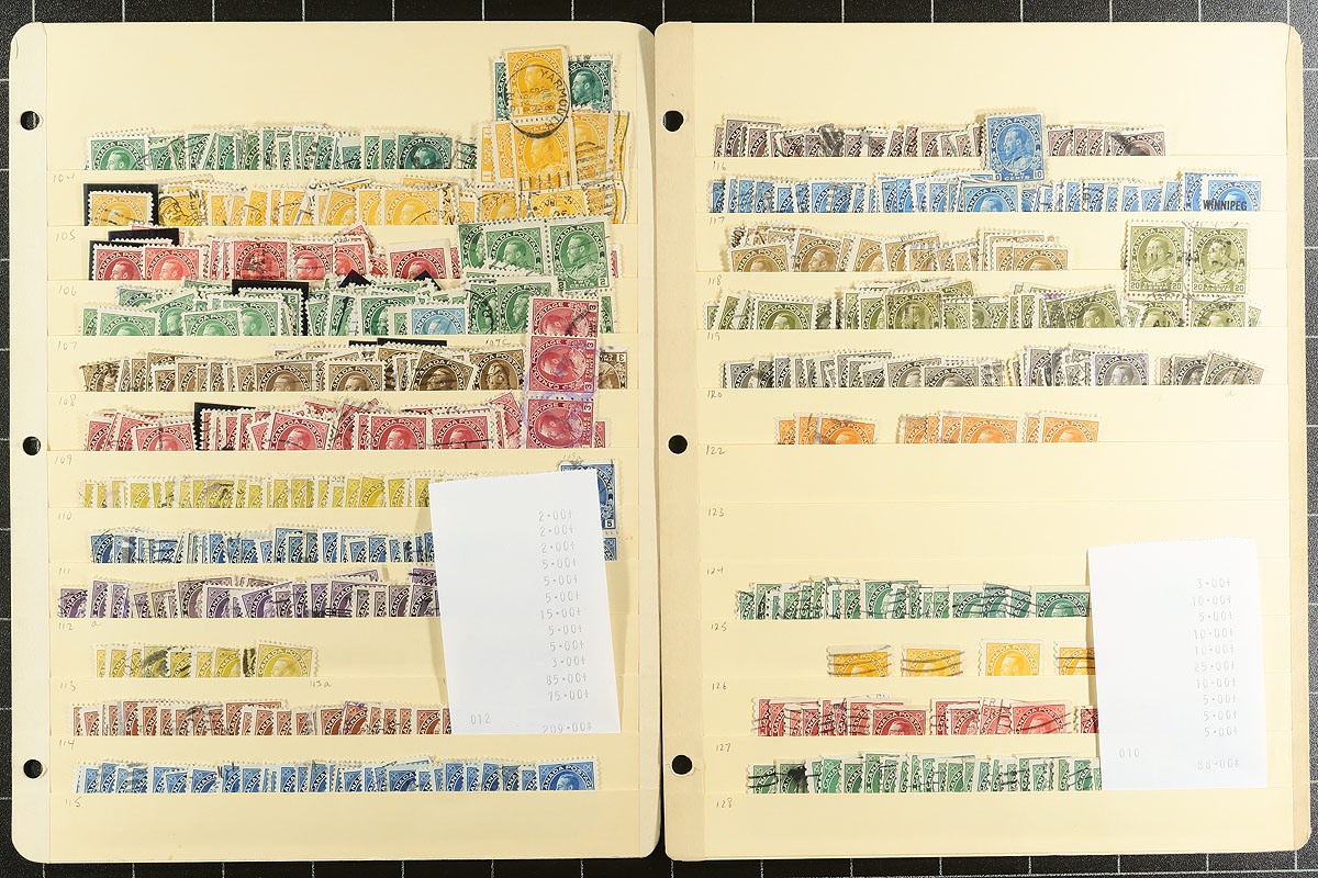 A high-quality old-time stock of early used Canadian material from 1859 "Cents" to the QEII Karsh issue, arranged on 27 manila pages, withing a binder. Loads of value here, and although the odd fault my be present in the earliest material, overall this is a very clean group. Lots of better postmarks noted, and a winters worth of "fly-specking" for the adventurous collector. Cataloged by the previous owner, using only the lowest value given, so plenty of upside to the valuation count. Owner's Unitrade =