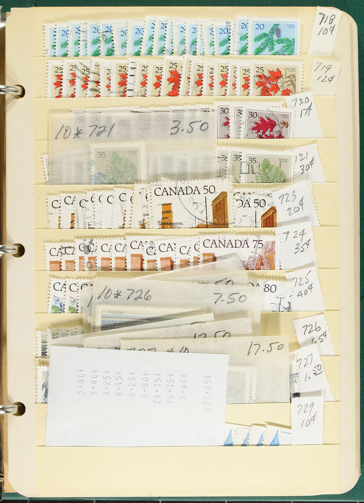 Comprehensive and clean used dealer stock of early QEII to 1990, plus "back of the book" 1975/1976 semi-postals and a smattering of earlier GeoVI "O.H.M.S." perfins. A well organized holding, arranged within 8 small green dealer "counter" books. Noted strengths in the early QEII era tagging, multiples, nice postmarks etc. A great opportunity for someone to acquire a large group of used Canada, where all the work of soaking / sorting has already been done. Owner's Unitrade =