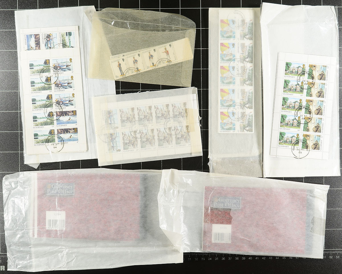 Accumulation of used Guernsey booklets and booklet panes, 1971-1999, containing roughly 130 complete panes, 65 complete booklets, along with a few other items, all with favour postmarks. Complete unexploded used booklets are difficult to find, Owner's Stanley Gibbons 2008 Collect Channel Islands and Isle of Man Stamps catalogue value for the lot totals £1,081.00. Duplication generally up to 5 for most issues, a nice lot for dealers and collectors alike, overall very fine. Estimate =