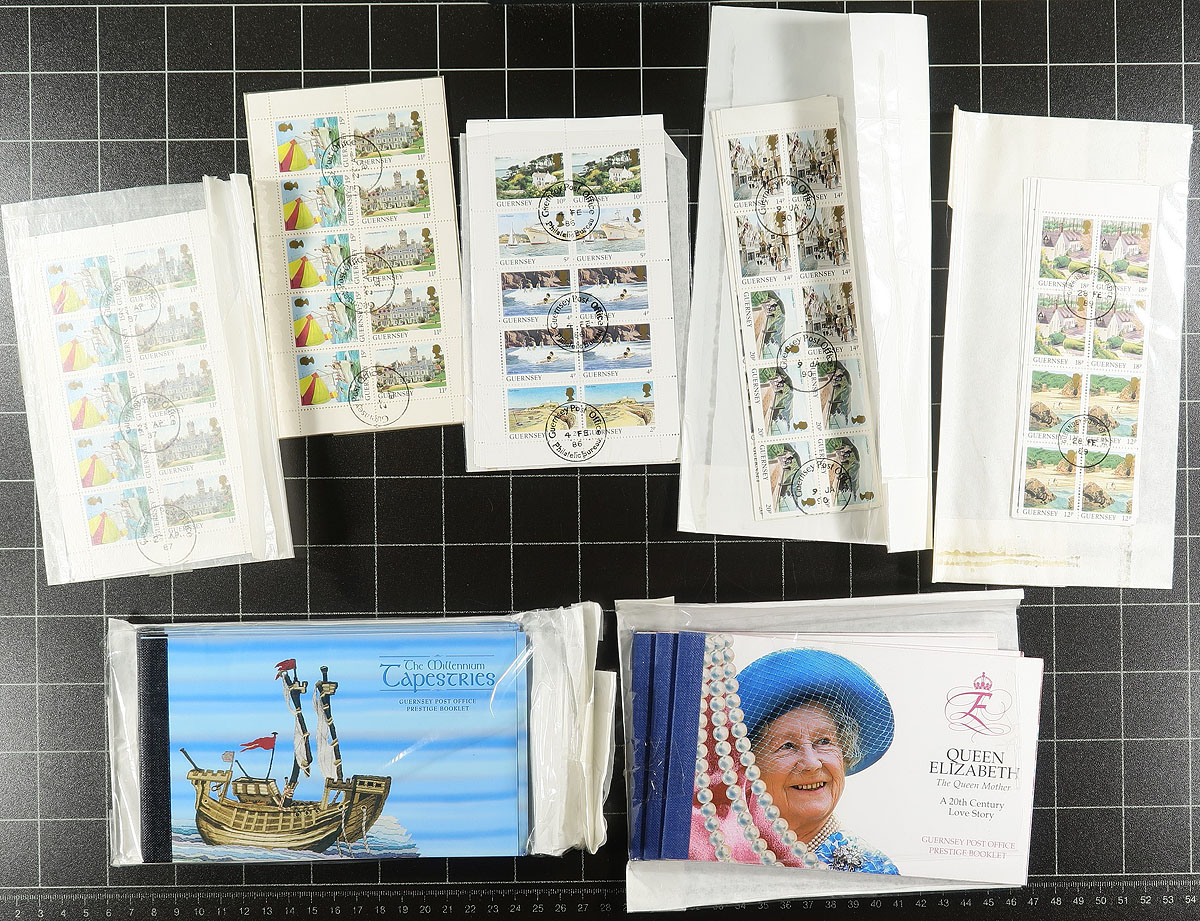 Accumulation of used Guernsey booklets and booklet panes, 1971-1999, containing roughly 130 complete panes, 65 complete booklets, along with a few other items, all with favour postmarks. Complete unexploded used booklets are difficult to find, Owner's Stanley Gibbons 2008 Collect Channel Islands and Isle of Man Stamps catalogue value for the lot totals £1,081.00. Duplication generally up to 5 for most issues, a nice lot for dealers and collectors alike, overall very fine. Estimate =