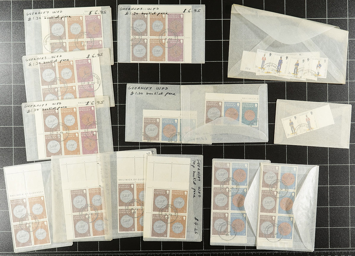Accumulation of used Guernsey booklets and booklet panes, 1971-1999, containing roughly 130 complete panes, 65 complete booklets, along with a few other items, all with favour postmarks. Complete unexploded used booklets are difficult to find, Owner's Stanley Gibbons 2008 Collect Channel Islands and Isle of Man Stamps catalogue value for the lot totals £1,081.00. Duplication generally up to 5 for most issues, a nice lot for dealers and collectors alike, overall very fine. Estimate =