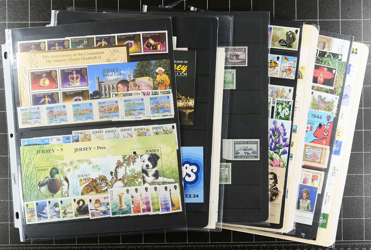 Collection of never hinged Jersey, 1977-2006, containing many hundreds of stamps in roughly 14 stock pages. The collection generally ranges from Scott #175/1214, including several sets, many souvenir sheets, a few sheetlets and booklets. The lot includes a selection of revenues from the 1930 to the 1970's with a few having "Specimen" overprints. Owner's Scott 2011 catalogue value for the lot totals US$1,114.00. A nice clean lot, ideal for all especially topical and thematic collectors as we encountered many suitable subjects. Estimate =