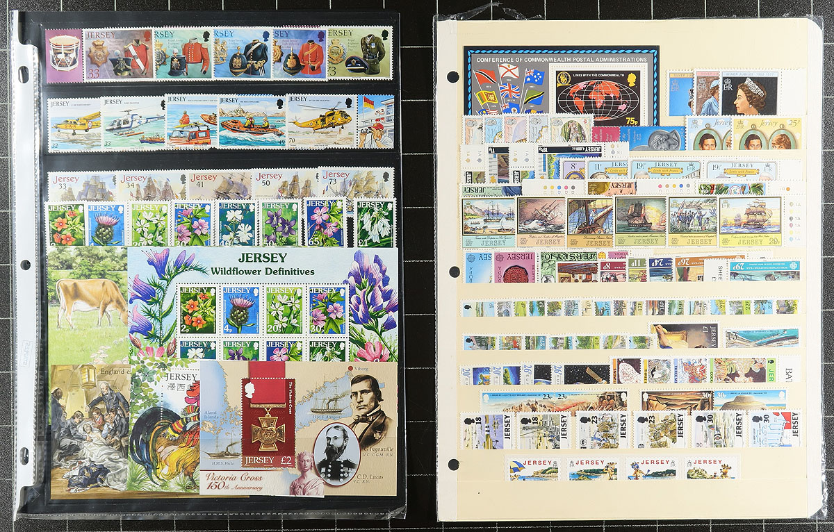 Collection of never hinged Jersey, 1977-2006, containing many hundreds of stamps in roughly 14 stock pages. The collection generally ranges from Scott #175/1214, including several sets, many souvenir sheets, a few sheetlets and booklets. The lot includes a selection of revenues from the 1930 to the 1970's with a few having "Specimen" overprints. Owner's Scott 2011 catalogue value for the lot totals US$1,114.00. A nice clean lot, ideal for all especially topical and thematic collectors as we encountered many suitable subjects. Estimate =