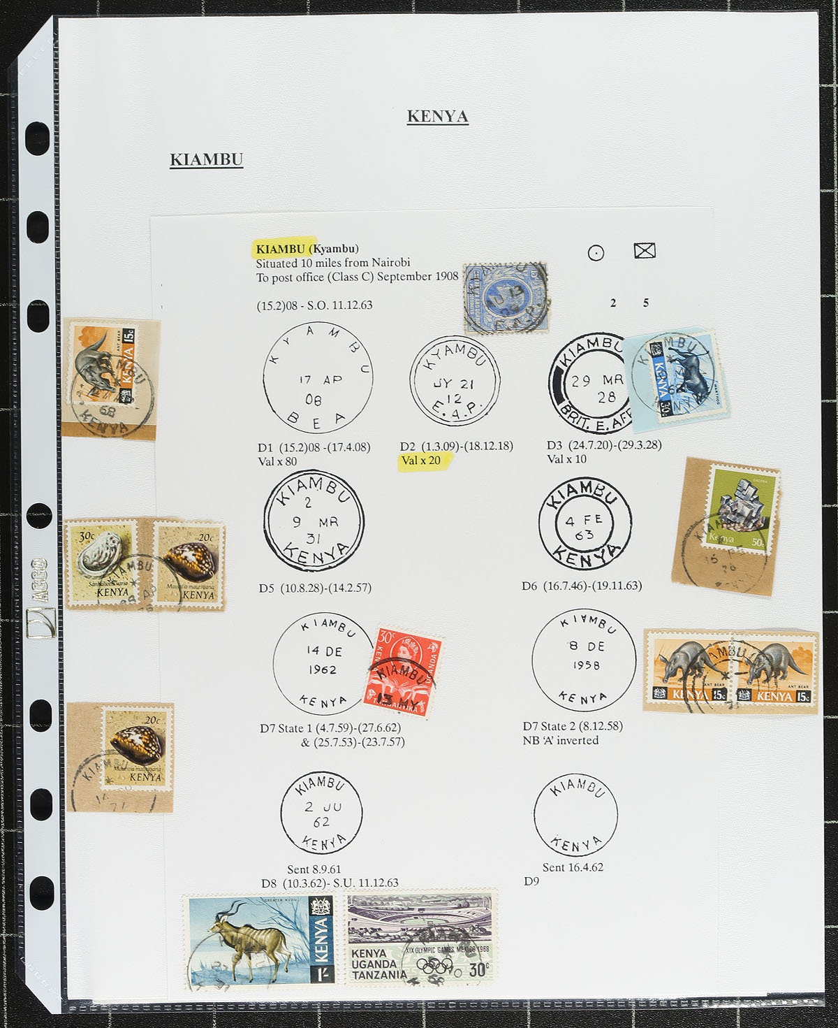 Collection of used Kenya collected for town postmarks, 1900-1990's, containing many hundreds of stamps and roughly 40 covers all neatly organized on homemade pages housed in 2 binders. The collection contains roughly 100 different towns, ranging from A to M including Asembo Bay, E.A. APO 67, Fort Ternan, Hoey's Bridge, Kitale, and much more, with at least one stamp or cover representing each town. The lot also includes maps and locations of most towns and photos from magazine articles. An interesting collection for the worldwide postmark collector and a nice basis for future expansion. Estimate =