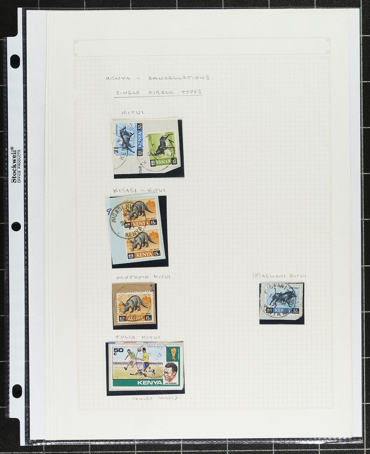 Collection of used Kenya collected for town postmarks, 1900-1990's, containing many hundreds of stamps and roughly 40 covers all neatly organized on homemade pages housed in 2 binders. The collection contains roughly 100 different towns, ranging from A to M including Asembo Bay, E.A. APO 67, Fort Ternan, Hoey's Bridge, Kitale, and much more, with at least one stamp or cover representing each town. The lot also includes maps and locations of most towns and photos from magazine articles. An interesting collection for the worldwide postmark collector and a nice basis for future expansion. Estimate =