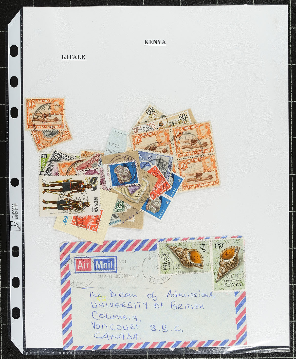 Collection of used Kenya collected for town postmarks, 1900-1990's, containing many hundreds of stamps and roughly 40 covers all neatly organized on homemade pages housed in 2 binders. The collection contains roughly 100 different towns, ranging from A to M including Asembo Bay, E.A. APO 67, Fort Ternan, Hoey's Bridge, Kitale, and much more, with at least one stamp or cover representing each town. The lot also includes maps and locations of most towns and photos from magazine articles. An interesting collection for the worldwide postmark collector and a nice basis for future expansion. Estimate =