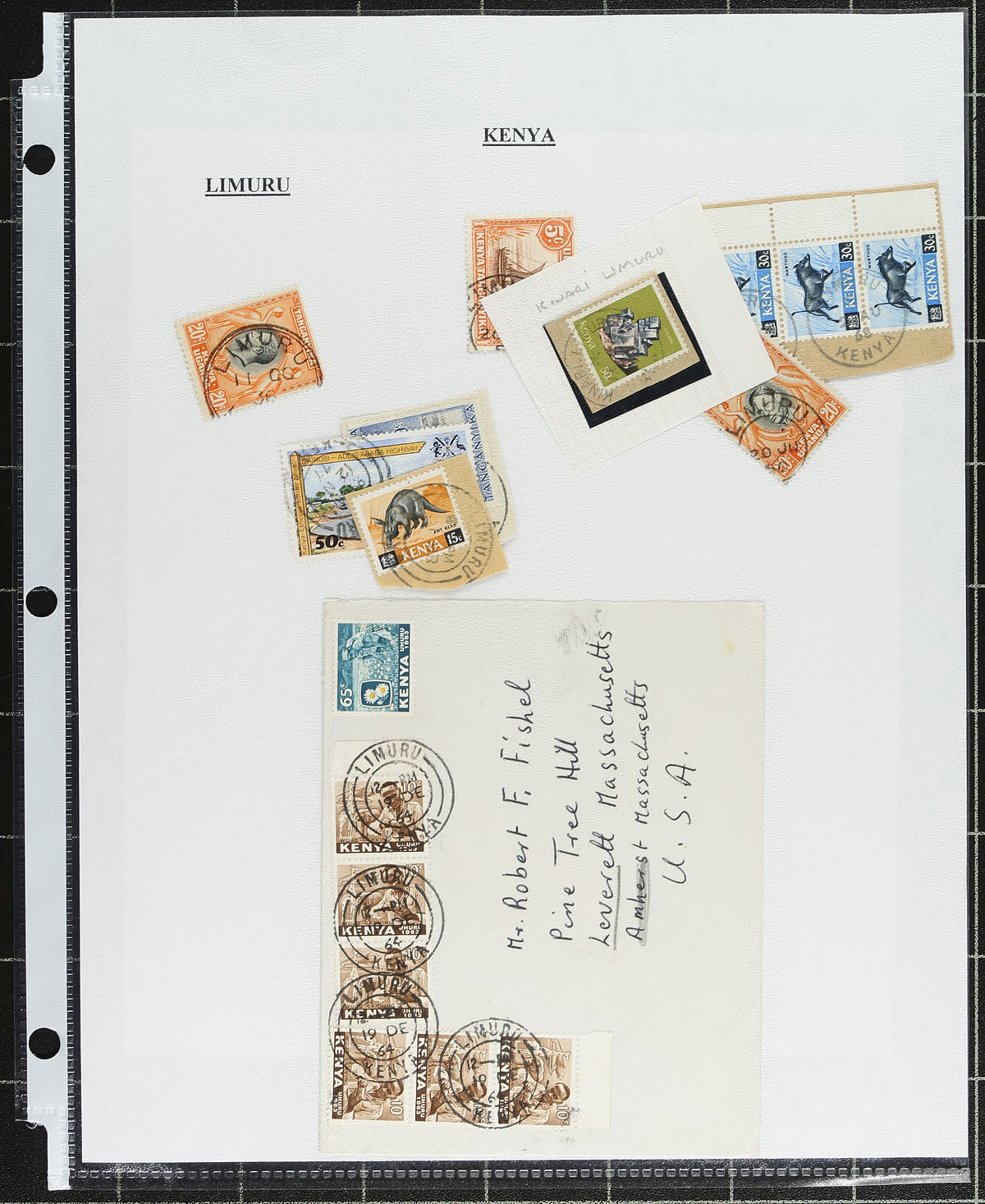 Collection of used Kenya collected for town postmarks, 1900-1990's, containing many hundreds of stamps and roughly 40 covers all neatly organized on homemade pages housed in 2 binders. The collection contains roughly 100 different towns, ranging from A to M including Asembo Bay, E.A. APO 67, Fort Ternan, Hoey's Bridge, Kitale, and much more, with at least one stamp or cover representing each town. The lot also includes maps and locations of most towns and photos from magazine articles. An interesting collection for the worldwide postmark collector and a nice basis for future expansion. Estimate =