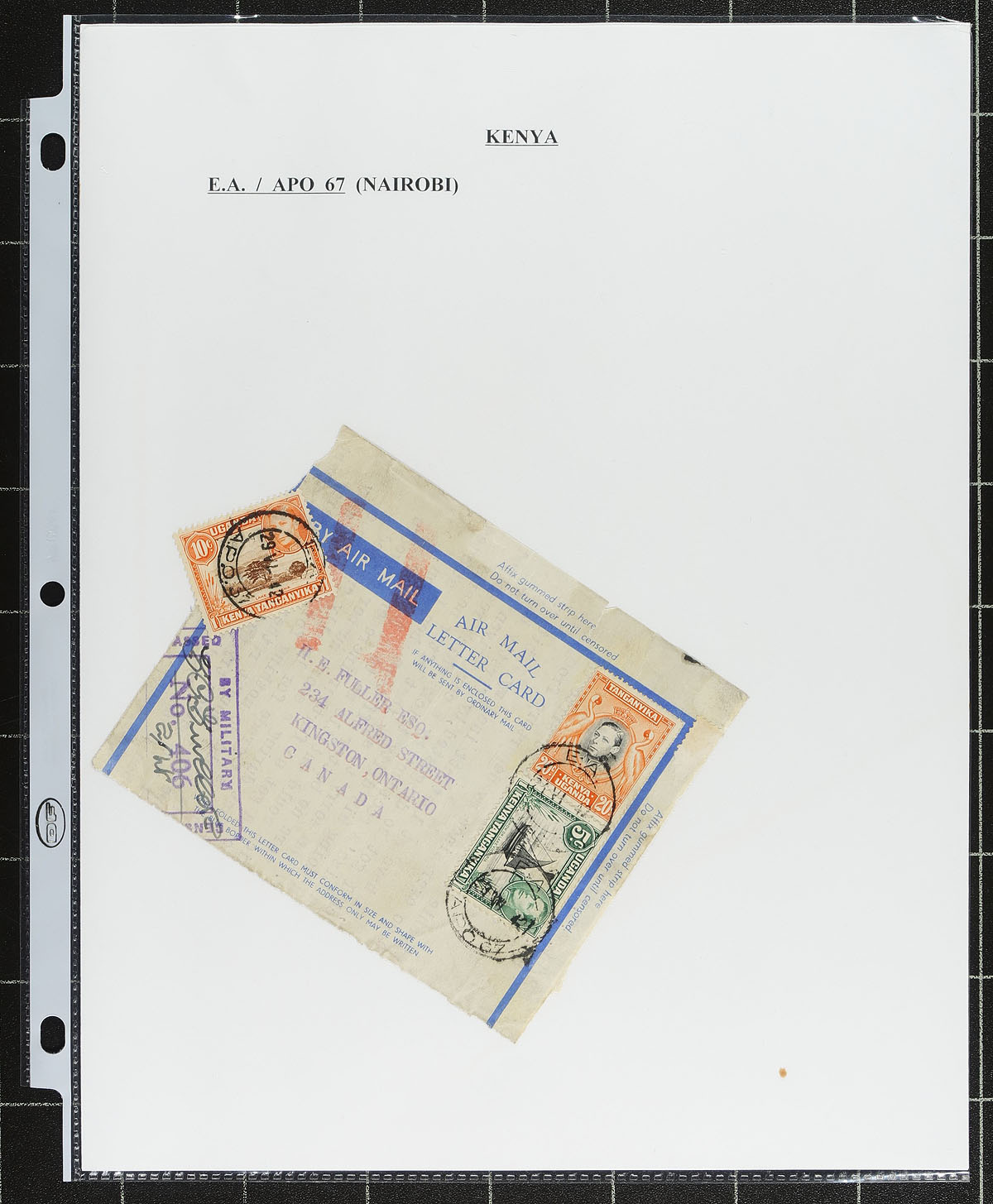 Collection of used Kenya collected for town postmarks, 1900-1990's, containing many hundreds of stamps and roughly 40 covers all neatly organized on homemade pages housed in 2 binders. The collection contains roughly 100 different towns, ranging from A to M including Asembo Bay, E.A. APO 67, Fort Ternan, Hoey's Bridge, Kitale, and much more, with at least one stamp or cover representing each town. The lot also includes maps and locations of most towns and photos from magazine articles. An interesting collection for the worldwide postmark collector and a nice basis for future expansion. Estimate =