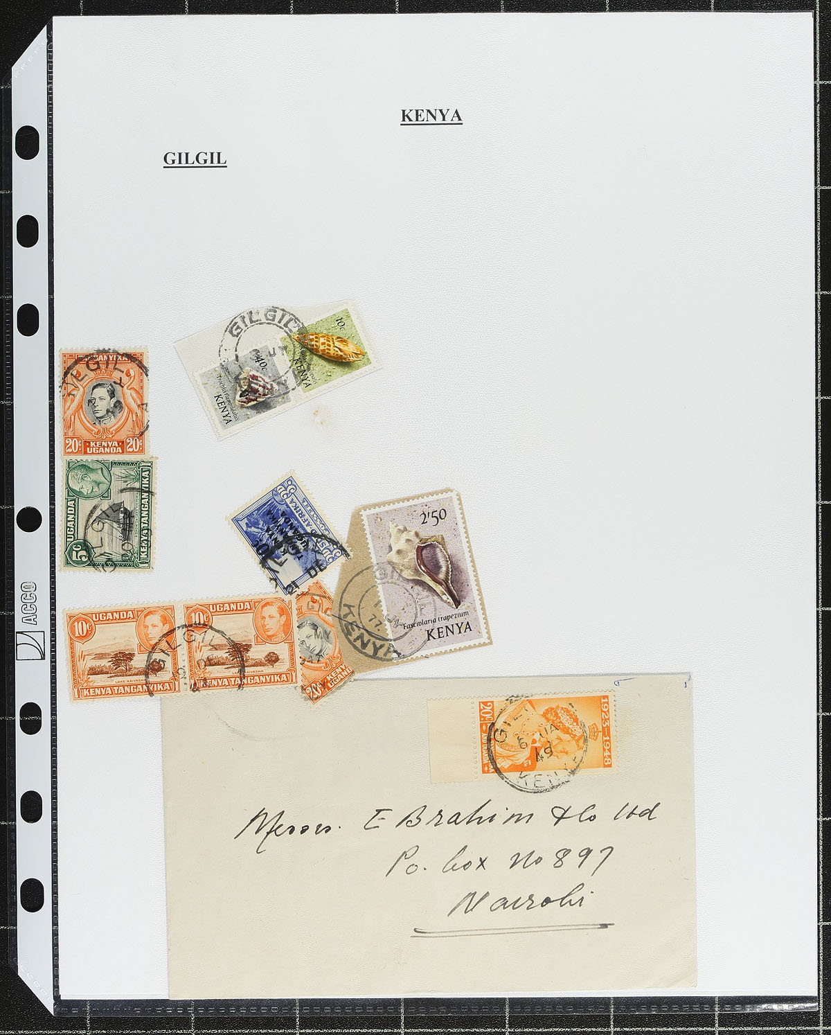 Collection of used Kenya collected for town postmarks, 1900-1990's, containing many hundreds of stamps and roughly 40 covers all neatly organized on homemade pages housed in 2 binders. The collection contains roughly 100 different towns, ranging from A to M including Asembo Bay, E.A. APO 67, Fort Ternan, Hoey's Bridge, Kitale, and much more, with at least one stamp or cover representing each town. The lot also includes maps and locations of most towns and photos from magazine articles. An interesting collection for the worldwide postmark collector and a nice basis for future expansion. Estimate =