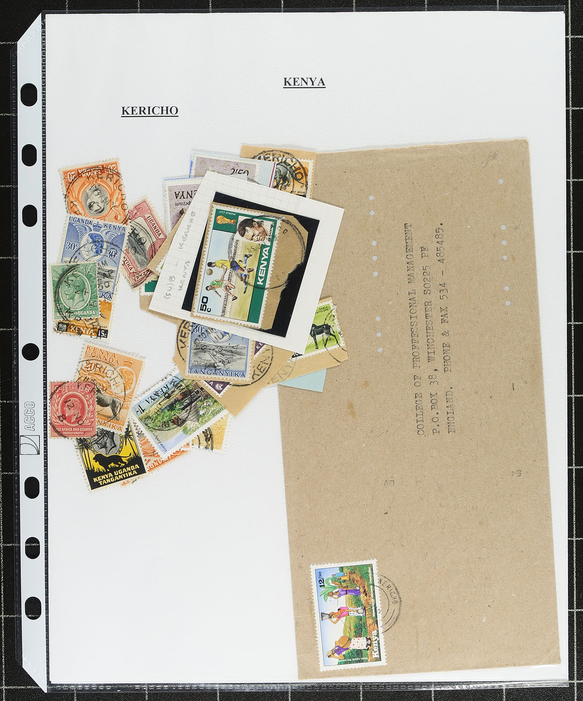 Collection of used Kenya collected for town postmarks, 1900-1990's, containing many hundreds of stamps and roughly 40 covers all neatly organized on homemade pages housed in 2 binders. The collection contains roughly 100 different towns, ranging from A to M including Asembo Bay, E.A. APO 67, Fort Ternan, Hoey's Bridge, Kitale, and much more, with at least one stamp or cover representing each town. The lot also includes maps and locations of most towns and photos from magazine articles. An interesting collection for the worldwide postmark collector and a nice basis for future expansion. Estimate =
