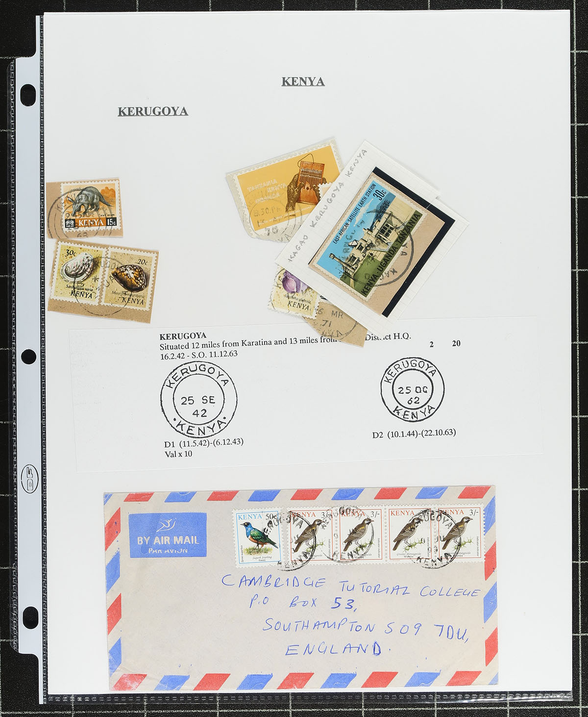 Collection of used Kenya collected for town postmarks, 1900-1990's, containing many hundreds of stamps and roughly 40 covers all neatly organized on homemade pages housed in 2 binders. The collection contains roughly 100 different towns, ranging from A to M including Asembo Bay, E.A. APO 67, Fort Ternan, Hoey's Bridge, Kitale, and much more, with at least one stamp or cover representing each town. The lot also includes maps and locations of most towns and photos from magazine articles. An interesting collection for the worldwide postmark collector and a nice basis for future expansion. Estimate =