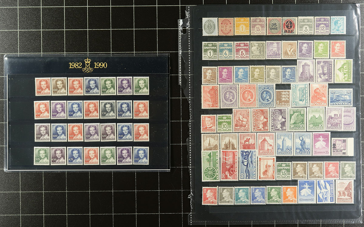 Clean group of mint Denmark, 1875-1990, containing roughly 650 stamps in a few stock pages and a group of 102 cards. The lot generally ranges from Scott #25/715, including several sets, and a selection of back of the book material. The lot also includes a nice Lindner album, with pages covering years 1976 to 1997. A nice group from this popular collecting country. Owner's older 2014 Scott US$919.00 =