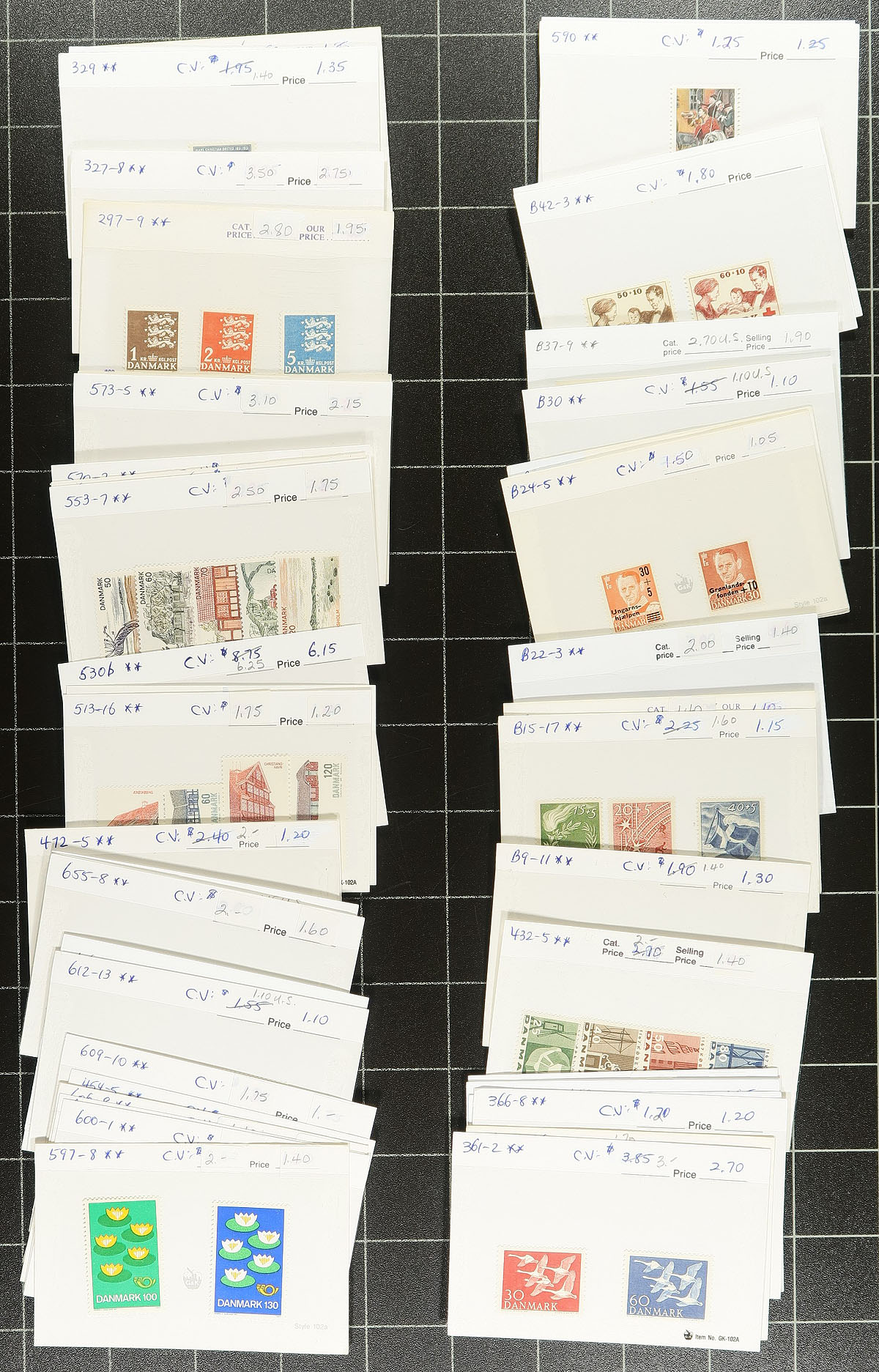 Clean group of mint Denmark, 1875-1990, containing roughly 650 stamps in a few stock pages and a group of 102 cards. The lot generally ranges from Scott #25/715, including several sets, and a selection of back of the book material. The lot also includes a nice Lindner album, with pages covering years 1976 to 1997. A nice group from this popular collecting country. Owner's older 2014 Scott US$919.00 =