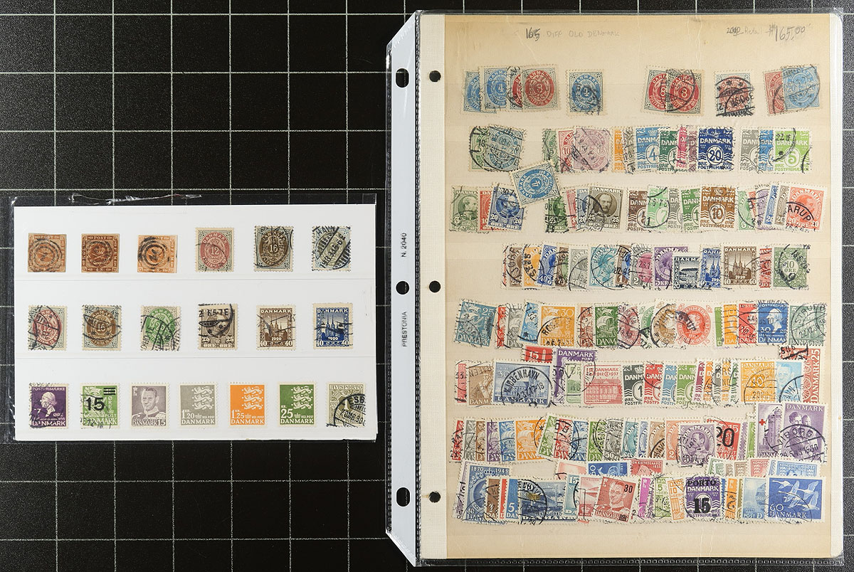 Collection of used Denmark, 1855-2002, containing over 1,200 stamps in roughly 13 stock pages. The collection generally ranges from Scott #4a/1220, along with a few pages of back of the book material, and a few blocks. A spot check indicated a few early stamps cataloguing $10 and up each. Postmark interest includes numerals and cds types, including a few "socked on the nose" town cancels. A few faults with a few of the stamps, overall fine to very fine. Owner's older 2014 Scott US$912.00 =