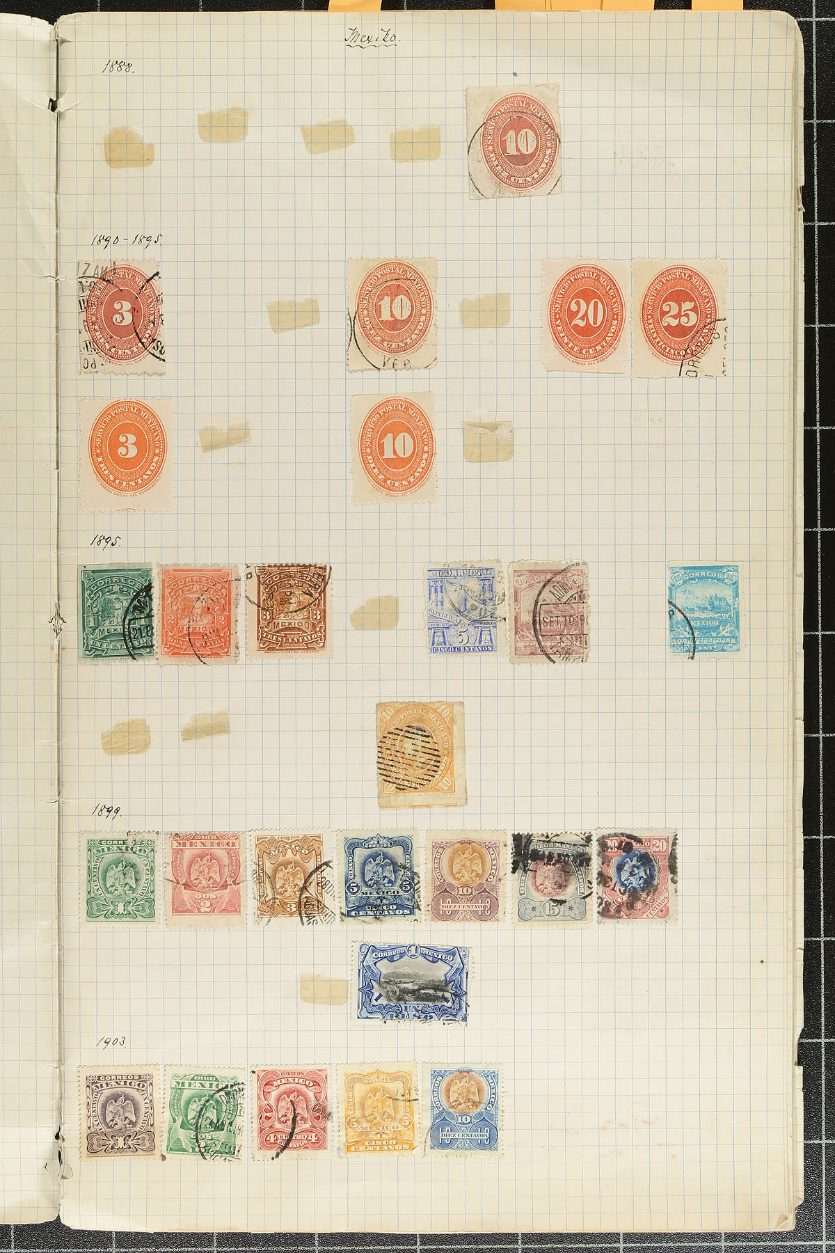 Old time album remainders of mint and used Central and South America, 1850's-1914, containing roughly 400 stamps on homemade pages. The collection contains better representation from Mexico and El Salvador, along with material from Nicaragua, Paraguay, Peru, Uruguay, and Venezuela. A spot check indicated a few stamps cataloguing $10 and up, noting selections of back of the book issues, and a few revenues. A few faults to be expected, but a nice start to this region containing classic issues. Estimate =